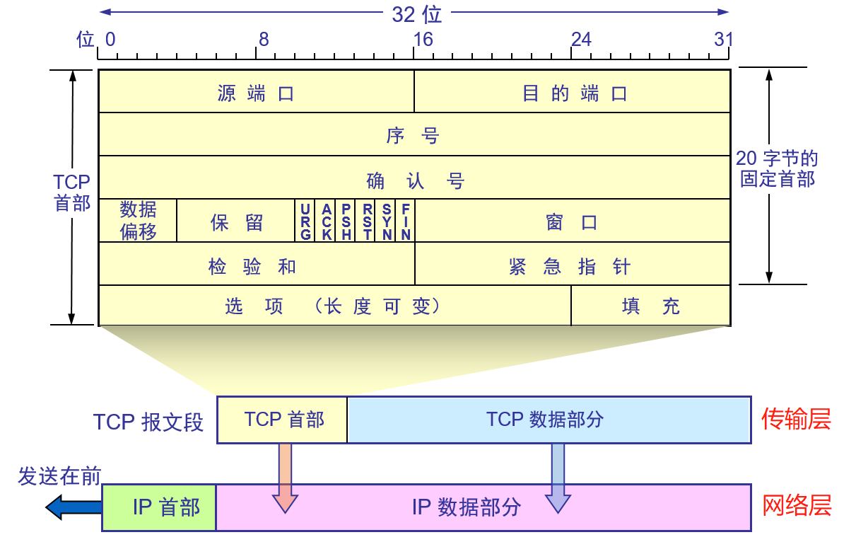 - 紧急指针: 占2字节,紧急指针仅在URG为1时才有意义,指出本报文段紧急数据(在数据段)的字节数;